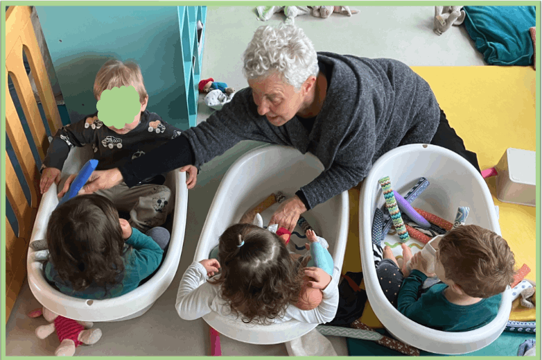 Ces tubes en tissus sont non seulement incitateurs de créativité, mais aussi un outil précieux d’expérimentation dans ce jeu d’aller-retour, de répétition, de faire et défaire, disparaître, apparaître qui construit le sentiment continu d’exister. Cette mise en perspective vient nourrir chez l’observateur, les possibilités d’accompagnements de chacun de là où il en est.